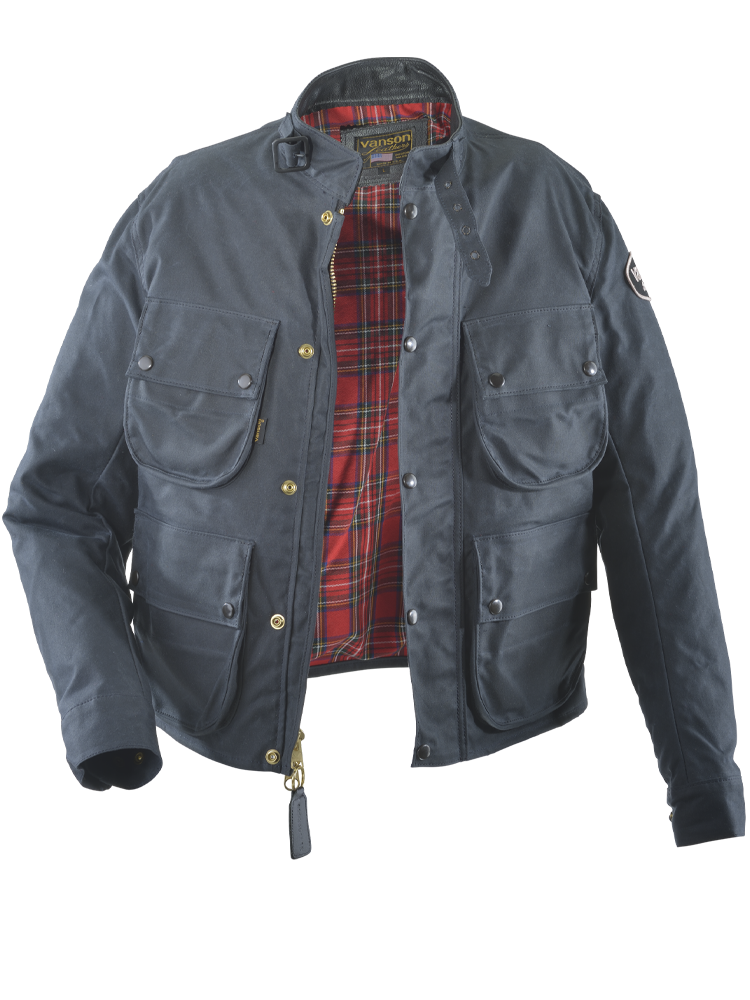 The Vanson Leathers Dover Wax Cotton Jacket (Model 4010 A150) is a classic TT-style motorcycle trials jacket
