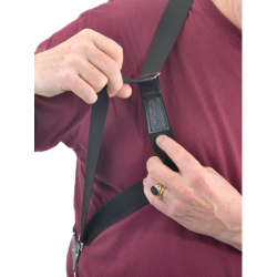 Fit (lengths) and elastic tension are controlled by sliding the adjuster-ovals up and down the front legs, The elastic we use is 1.5 inches wide for optimal strength and comfort over the shoulders.
