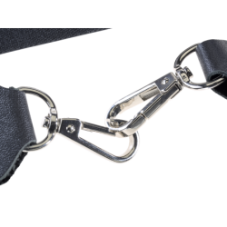 Each leg is secured via a spring-loaded swivel-clip to a pant beltloop. Top-grain leather is used to cut folding attachments secured with rivets.