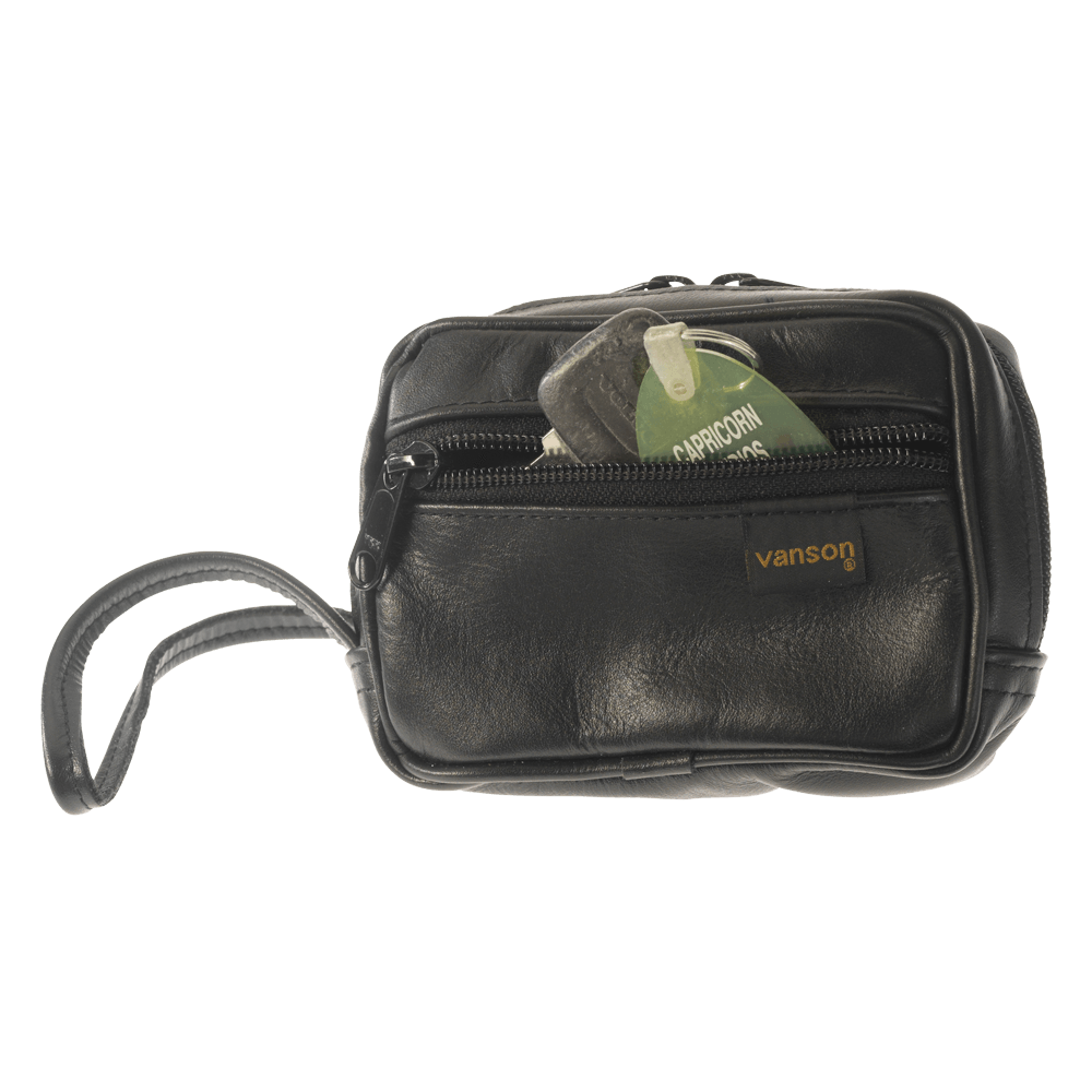 A colorful little bag made from the same top-quality leather as our jackets, the Vanson Clutch has three inside credit card slots facing a clear ID window. Add an outer side pocket, two sturdy belt-loops and a wrist-strap and   -   voila    -   a safe and stylish home for your keys, cards, IDs and other small essentials. They can be ordered in your choice of solid colors. Every now and then multicolored (and sometimes even polychrome) versions, with the color scheme chosen on the fly by their maker, are available in the showroom only.