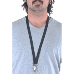 All lanyards are black twill tape with either black (tone on tone) or gold embroidery. The business end is a polished nickel-plated heavy-duty solid brass swivel-hook. The embroidery is the Vanson logo. Practical. Convenient. And very secure. Might even get you into the West Wing of the White House...