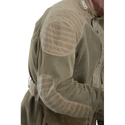 Start with the 1000 denier Cordura heavy mesh that makes up most of the outside shell. Cordura yarn was developed by DuPont to replace the steel used in radial tires. It is strong. It resists abrasion. It does not degrade. Knitted into a heavy-duty mesh it brings you all these qualities and allows 100% airflow. Once you touch the material you can feel the toughness. To this we add 1010 Army Duck waxed cotton, also a very strong but breathable material. It has a natural look and feel, and like the Cordura mesh only needs to be hosed off, then air-dried, for true on-the-go round-the-clock use. In the shoulders a double layer of military-derived ballistic nylon spacer fabric is used, which resists compression, so giving additional padding and energy absorption. It offers little resistance to airflow, so cooling air can flow through it when you are hot.