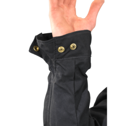 Four stormproof reinforced pockets with snap flaps are on the front. At the waist are two D-rings of solid brass to let the jacket be cinched in as needed. Triangular armhole geometry at the sleeves allows phenomenal ease of movement and forward reach. The collar, being a heavy wear area, is lined with leather.