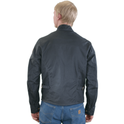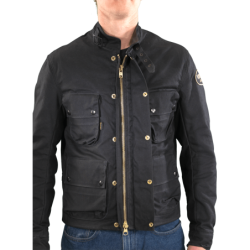 Crafted from durable Army 1010 Black wax cotton canvas for reliable weather protection and timeless riding style. Fully lined for comfort, the jacket features a belted adjustable waist with side tabs and double D-rings for a customizable fit, along with a leather-lined collar and neck beltlet with buckle.
