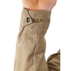 Crafted from durable Army 1010 Field Tan wax cotton canvas for dependable weather protection and classic riding style. Fully lined for comfort, it features a belted adjustable waist with side tabs and double D-rings for precise fit adjustment, along with a leather-lined collar and neck beltlet with buckle.