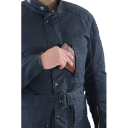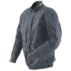 Start with a belted military tunic. Cut to hip-length for comfort. Add a two-way center-front zipper for a perfect fit on the bike without bunching up. This zipper is covered by a snapped storm-flap, to avoid scratching your tank. CE-approved protection is included at the shoulders and elbows, with a back pad in a pouch sewn into the lining. Its uniform-style full belt has a leather-covered buckle...again we thought of your tank. A leather keeper, embossed with the unit number of the jacket, is on your left side near the buckle, making sure the belt stays with you. The sleeves are finished with race-style turned leather ends, and leather guards are under the wrist zippers.