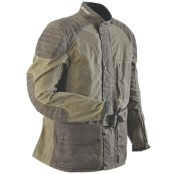 Start with a belted military tunic. Cut to hip-length for comfort. Add a two-way center-front zipper for a perfect fit on the bike without bunching up. This zipper is covered by a snapped storm-flap, to avoid scratching your tank. CE-approved protection is included at the shoulders and elbows, with a back pad in a pouch sewn into the lining. Its uniform-style full belt has a leather-covered buckle...again we thought of your tank. A leather keeper, embossed with the unit number of the jacket, is on your left side near the buckle, making sure the belt stays with you. The sleeves are finished with race-style turned leather ends, and leather guards are under the wrist zippers.