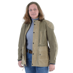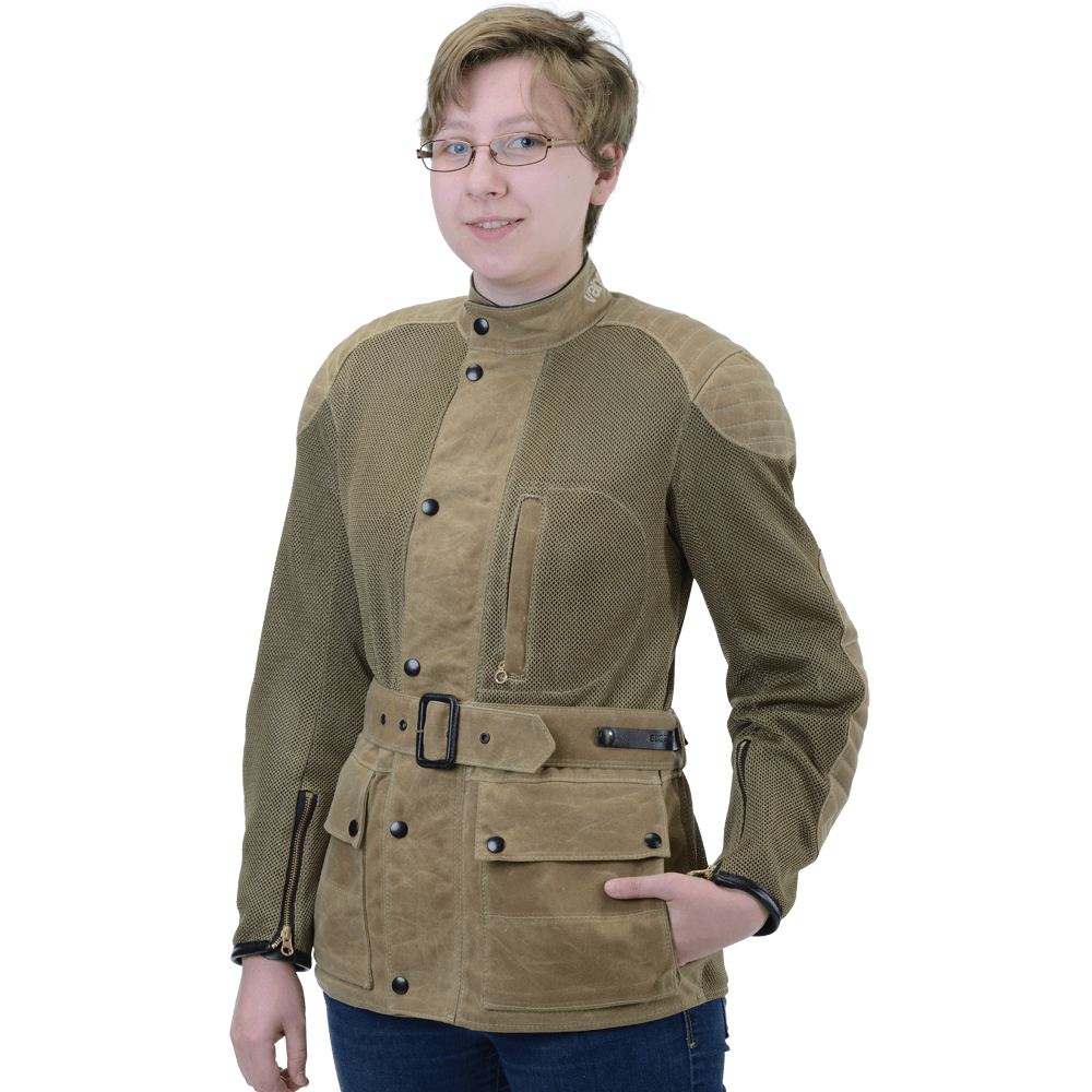 Start with the 1000 denier Cordura heavy mesh that makes up most of the outside shell. Cordura yarn was developed by DuPont to replace the steel used in radial tires. It is strong. It resists abrasion. It does not degrade. Knitted into a heavy-duty mesh it brings you all these qualities and allows 100% airflow. Once you touch the material you can feel the toughness. To this we add 1010 Army Duck waxed cotton, also a very strong but breathable material. It has a natural look and feel, and like the Cordura mesh only needs to be hosed off, then air-dried, for true on-the-go round-the-clock use. In the shoulders a double layer of military-derived ballistic nylon spacer fabric is used, which resists compression, so giving additional padding and energy absorption. It offers little resistance to airflow, so cooling air can flow through it when you are hot.