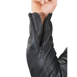 PERFORATED BLACK FIRENZE + BONE SLEEVE STRIPE LEATHERS. Selected skins that have been milled for extra softness and a slight pebble look. Milling brings the grain up making the natural markings a little more pronounced. Skins are then perforated using a mini perforation pattern to maximize ventilation while retaining original strength and smooth look. These MEDIUM WEIGHT leathers are 1.2 mm. thick.
