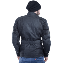 Start with the 1000 denier Cordura heavy mesh that makes up most of the outside shell. Cordura yarn was developed by DuPont to replace the steel used in radial tires. It is strong. It resists abrasion. It does not degrade. Knitted into a heavy-duty mesh it brings you all these qualities and allows 100% airflow. Once you touch the material you can feel the toughness. To this we add 1010 Army Duck waxed cotton, also a very strong but breathable material. It has a natural look and feel, and like the Cordura mesh only needs to be hosed off, then air-dried, for true on-the-go round-the-clock use. In the shoulders a double layer of military-derived ballistic nylon spacer fabric is used, which resists compression, so giving additional padding and energy absorption. It offers little resistance to airflow, so cooling air can flow through it when you are hot.