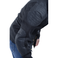 BLACK CORDURA 1000 DENIER HEAVY DUTY MESH + BLACK ARMY DUCK 1010 WAX COTTON are combined to create a unique hybrid jacket ideal for hot weather riding. The Cordura mesh is very strong and abrasion-resistant while also allowing maximum airflow. V150 BLACK HEAVY-DUTY VENT MESH High-tenacity 1000 denier nylon yarn is used to knit this mesh material. It is finished with a bonding treatment that enhances the strength of the material. . ARMY DUCK 1010 ( 10 oz. ) BLACK Waxed Cotton Wax cotton combines breathability with water repellency which make the material very comfortable in a wide range of conditions. Wax cotton can be reconditioned and re-proofed using the Vanson wax sold separately. Use a hair dryer to heat the area of the garment needing wax work the wax paste into the Duck using a dry cloth and a circular motion. Note: Do not wash or dry-clean this garment as it will harm both the coating on the Cordura and the wax in the wax cotton. To clean this garment simply hose off with cool water and air-dry in a cool place.