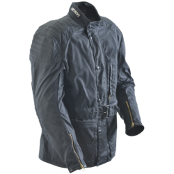Start with a belted military tunic. Cut to hip-length for comfort. Add a two-way center-front zipper for a perfect fit on the bike without bunching up. This zipper is covered by a snapped storm-flap, to avoid scratching your tank. CE-approved protection is included at the shoulders and elbows, with a back pad in a pouch sewn into the lining. Its uniform-style full belt has a leather-covered buckle...again we thought of your tank. A leather keeper, embossed with the unit number of the jacket, is on your left side near the buckle, making sure the belt stays with you. The sleeves are finished with race-style turned leather ends, and leather guards are under the wrist zippers.