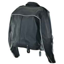 It can also get cold in Modesto... so there are snaps on the inside facing to accommodate the insulated Vanson Streamliner reversible vest, and a windflap behind the main zipper. For night-time riding, the 3M reflective piping across the back and down the sleeve outseams provides additional safety. The Vanson unit-number is stamped on a pen holder set onto the left front facing. Snap-down shoulder epaulets provide a handy spot to secure a radio microphone. Twin badge-holder grommets are set into a protector patch sewn onto the left chest. This is one jacket that will serve and protect for many years.