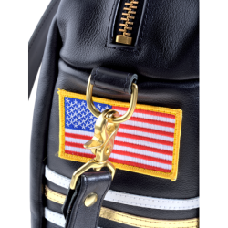 Designed for versatility, this bag includes a detachable shoulder strap, durable brass hardware, and a Cordura-lined interior. Storage features include an interior open-top wallet pocket and a zip-close front glove pocket with a long leather zipper pull. An ID key fob embossed with the garment’s unit number completes this commemorative piece, blending heritage styling with everyday functionality.