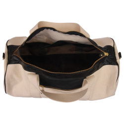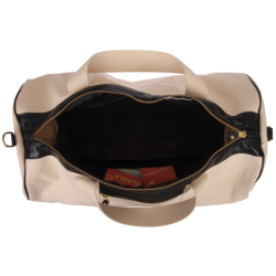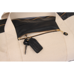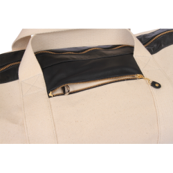 The outer shell is built of Natural cotton that has been treated to resist water and soiling. Built into the front panel is a zippered pocket with an anti-wear top lip made of leather. Inside this pocket hangs a leather tab with a swivel-clip built in to secure your key ring. No more fishing for your keys "somewhere in the bag...".