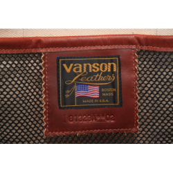 Along the inside back panel is a two compartment mesh pocket with a leather bead across the top. The Vanson Unit Number is embossed into a leather patch top stitched to the mesh pocket.