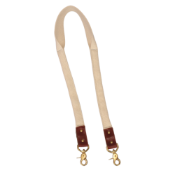 The strap is folded and stitched at each end for a narrow profile then left open and wide in the center section for maximum over-the-shoulder comfort. Brass Swivel-clips are secured in leather attachments riveted through the webbing.