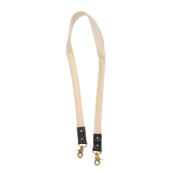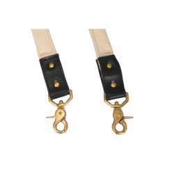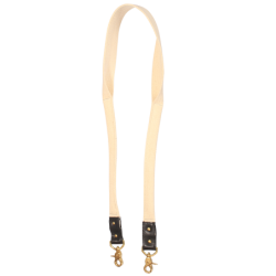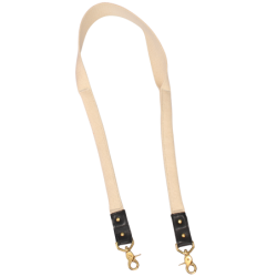The strap is folded and stitched at each end for a narrow profile then left open and wide in the center section for maximum over-the-shoulder comfort. Brass Swivel-clips are secured in leather attachments riveted through the webbing.