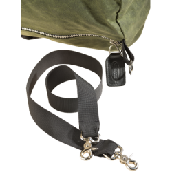 The shoulder strap is attached with two claw swivel clips and cut short so as to make carrying a loaded bag under the arm, close to the waist, and not hanging down knee length.