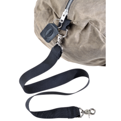 The shoulder strap is attached with two claw swivel clips and cut short so as to make carrying a loaded bag under the arm, close to the waist, and not hanging down knee length.