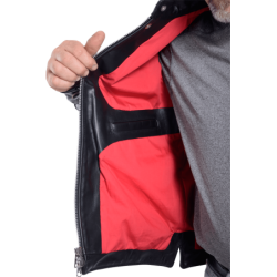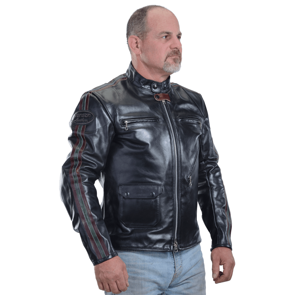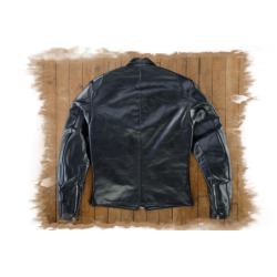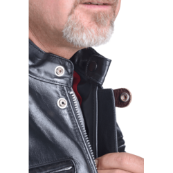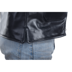 Zippered fronts had become more common instead of buttons and hooks. The front was shortened so contact with the thighs would not push the jacket up into the rider's throat. A moderately-dipped back was added to support the kidney area and help seal out the wind. To keep the freedom of a full-blouson upper-torso cut with wind-tight snug waist, we added traditional double side-buckles of polished solid brass.We also incorporated a concealed carry leather lined gun pocket.