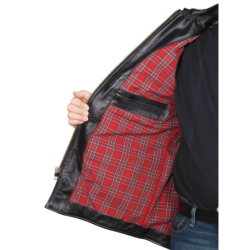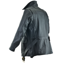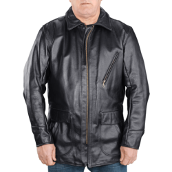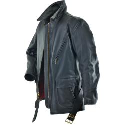 This is a ¾-length, mid-thigh-length coat with a waist-belt to snug up the fit. Modern functional touches include 1948 bomber-style integrated cargo and hand pockets, and a shirt-style collar. The waist-belt is made from two half-belts attached at the natural waist on the rear panel with leather buttons. The lining is a red plaid cotton blend with black rayon sleeves for easy slip-on comfort. Inside there is a secure deep wallet-pocket anchored to the leather inside facing. This is a jacket that will grow and shape to you, becoming an alter ego, a good friend. So, don't leave home without it, even if your car has one of those new-fangled heater things!