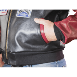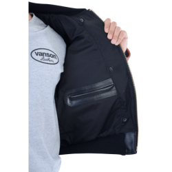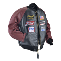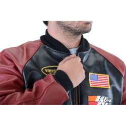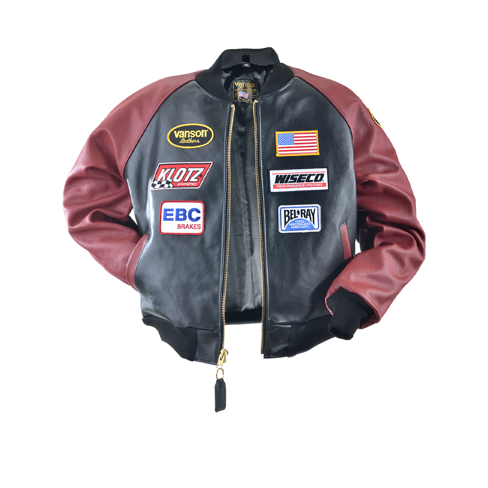 The Vanson RACE TEAM JACKET features a full-cut leather body with wool knit collar, cuffs and waistband, sports racing sponsor patches, and an embroidered Vanson oval logo on the front and left sleeve. It's made from beefy competition-weight cowhide, black on the front and back with red leather sleeves and pocket trim, two hand pockets, two inside pockets, a comfortable rayon lining, and a solid brass front-close zipper. Our RACE TEAM JACKET is also set up to receive the insulated, reversible Vanson Streamliner with its removable sleeves and lace-adjustable sides. For a great look with great comfort imagine yourself wearing a Vanson RACE TEAM JACKET.