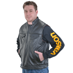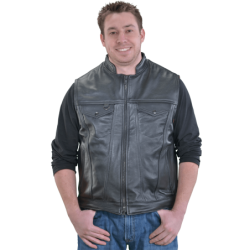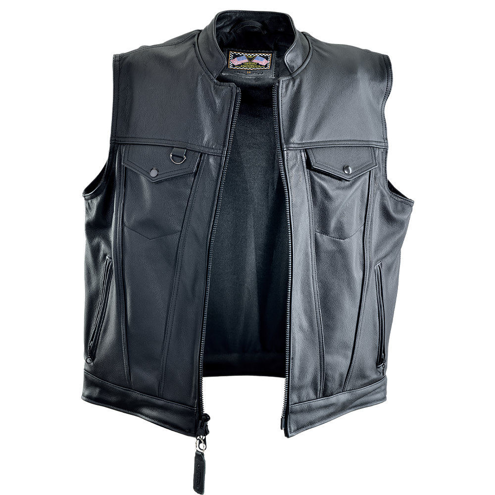 Designed and cut like the famous denim vest that won the West, the Vanson REVOLVER is a zip-front leather version that features a two-way center-front zipper for maximum riding comfort.