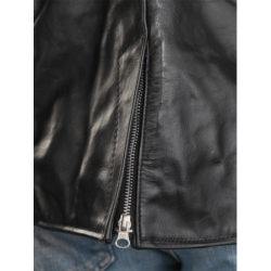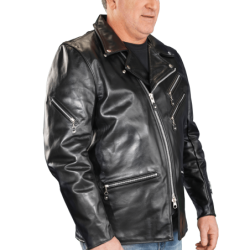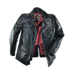 A shaped cutaway under the right side front zipper and the use of a two-way front zipper allow the front to be opened up from the bottom as needed for a comfortable ride. The slant front zipper and wide lapels can either be opened for "The Look", or closed for warmth. On the inside, the jacket is beautifully finished with full facings.