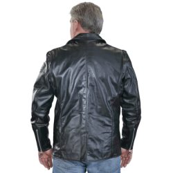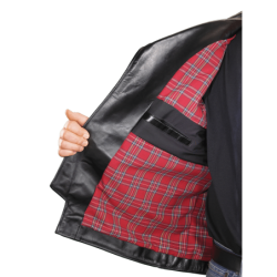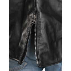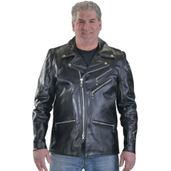 A shaped cutaway under the right side front zipper and the use of a two-way front zipper allow the front to be opened up from the bottom as needed for a comfortable ride. The slant front zipper and wide lapels can either be opened for "The Look", or closed for warmth. On the inside, the jacket is beautifully finished with full facings.