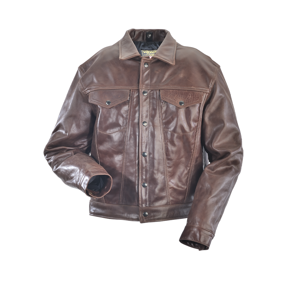 Cut and stitched using carefully selected hides, the MAVERICK is both casual and fashionable with that noticeable handmade Vanson execution. Faithful to the original Western design, the two top pockets with inset flaps and the side tabs are snap set. Double needle, topstitch details and an inside lining pocket make this jacket a highly functional, retro jacket in the classic Western style.