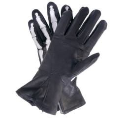 In 1985 - a Bad Year as you already know - we introduced our Rocket Gloves. In 1990 - arguably an Even Worse Year, with the Royal New Zealand Navy finally abolishing the daily rum ration and Tim Berners-Lee putting up the first web-server - we added the anatomical bones motif to the Rocket Gloves to complement our Vanson Bone Suits and Jackets. We decided to call them X-RAY Gloves. You might not want to use them in a surgical procedure, but they are still pretty darn realistic.Leaving aside for a moment the Bone motif, Vanson X-RAY Gloves are elegantly old-school, with a long, integrated, zippered cuff and a one-piece hand, meaning the top continues into the palm of the hand along the index-finger side, in one piece of leather. An extravagant construction - demanding large pieces of carefully prepared and matched leather for a perfect pair of gloves - but with the advantages of a greatly superior smooth round forefinger fit and a slim, fitted wrist.