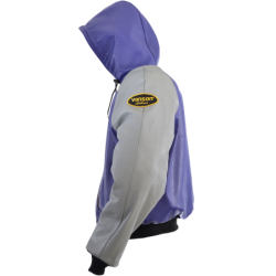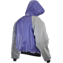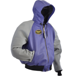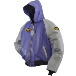 The Vanson Leathers Hooded Competition Team Jacket (TJPH PURP) is a standout, racing-inspired leather hoody built from rich purple and steel leather. Featuring bold competition patches and signature Vanson ovals, this jacket combines classic moto style with functional design. It includes a draw-string adjustable hood, knit waistband, cuffs, and collar for a comfortable fit, plus a zip-front closure with brass hardware. Practical details include two interior button-close lining pockets on black rayon, two front open hand pockets, and STREAMLINER snaps for attaching a streamliner vest. Assorted stitched racing patches (which may vary) add character, and an ID key fob embossed with the garment’s unit number offers useful reference.