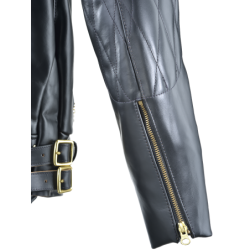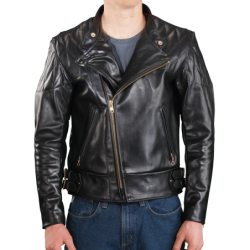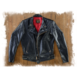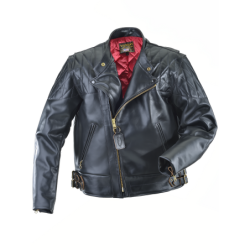 Zippered fronts had become more common instead of buttons and hooks. The front was shortened so contact with the thighs would not push the jacket up into the rider's throat. A moderately-dipped back was added to support the kidney area and help seal out the wind. To keep the freedom of a full-blouson upper-torso cut with wind-tight snug waist, we added traditional double side-buckles of polished solid brass.We also incorporated a concealed carry leather lined gun pocket.