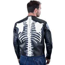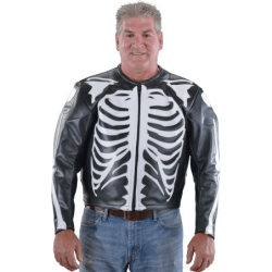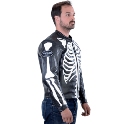 BLACK JACKET with WHITE bones - COMPETITION WEIGHT LEATHER Full weight 1.4 mm (3.50 to 3.75 oz) competition leather. Revolution is the leather of choice when you really need protection on or off the track. We have been making jackets and racing suits out of this leather for over 40 years. It works. And it lasts. With minimal care it lasts a long time. We repair and maintain garments over 30 years of age regularly. It is as simple as that.