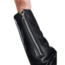 Good for a night out with friends, too. Beautifully cut with a huge one piece back no seams, no tiny little pieces puzzled together to save leather. Big generous front panels too. This jacket is cut and built in the old way, which would be called uneconomic today, but we call No Compromises. Full-size 2" wide half belts sewn into the side seams, with a big polished nickel-plated solid brass buckle to keep the waist snug. Available in both competition-weight and medium-weight cowhide. With zippered hand pockets, a zippered glove pocket, even a snap-close cigarette/ cellphone pocket, and classic chrome hardware throughout. Hand built in America. Destined to become a prized heirloom. In a word, Thunderbird!