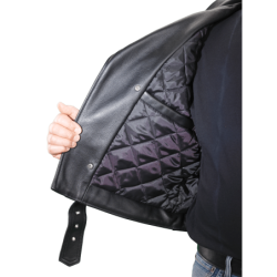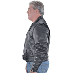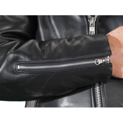 but we call No Compromises. Full-size 2" wide half belts sewn into the side seams, with a big polished nickel-plated solid brass buckle to keep the waist snug. Available in both competition-weight and medium-weight cowhide. With zippered hand pockets, a zippered glove pocket, even a snap-close cigarette/ cellphone pocket, and classic chrome hardware throughout. Hand built in America. Destined to become a prized heirloom. In a word, Thunderbird!