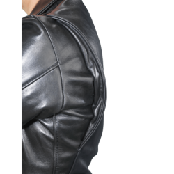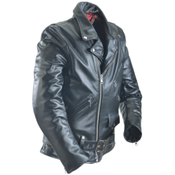 The always cool look of a "biker" jacket is enhanced by the polished two-way zipper, big belt, and traditional overlapping snap-down collar and lapels. Open the bottom of the two-way front zipper for a more comfortable ride. Close up the zippers and collar lapels to slice through winter weather in the comfort of warmth.
