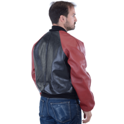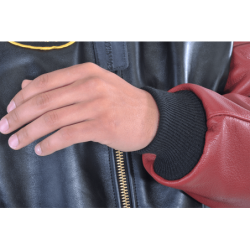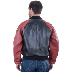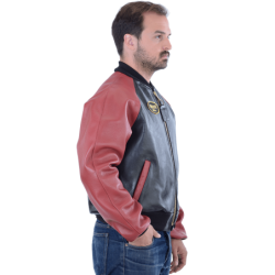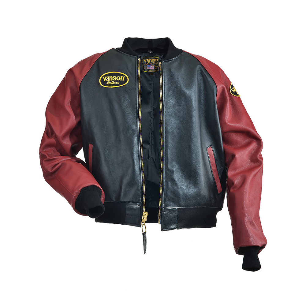 The Vanson LOGO TEAM JACKET features a full-cut leather body with wool knit collar, cuffs and waistband, along with an embroidered Vanson oval logo on the front and left sleeve. It's made from beefy competition-weight cowhide, black on the front and back with red leather sleeves and pocket trim, two hand pockets, two inside pockets, a comfortable rayon lining, and a solid brass front-close zipper. Our LOGO TEAM JACKET is also set up to receive the insulated, reversible Vanson Streamliner with its removable sleeves and lace-adjustable sides. For a great look with great comfort imagine yourself wearing a Vanson LOGO TEAM JACKET.