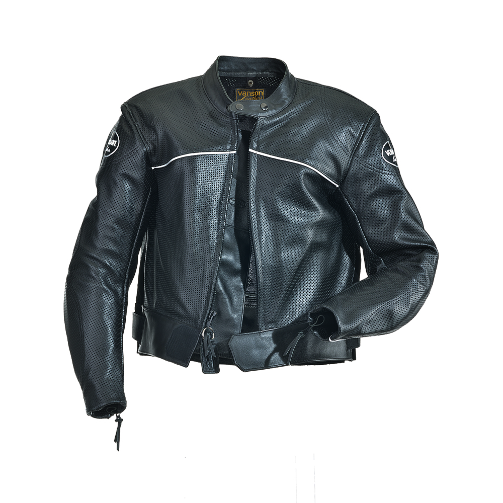 Serious road-work on a hot day has never been more comfortable than when wearing a Vanson Hurricane Jacket. Air-flow cool comfort and armored protection make for comfortable low altitude flying under the radar. Combining competition weight leather with all-over-body perforations creates a no compromise comfort zone similar to the Road Race Suits we make for endurance races. For cooler nights and days use the optional, removable and adjustable Streamliner vest to extend the riding season.