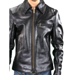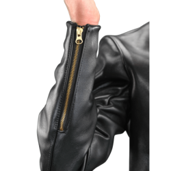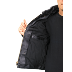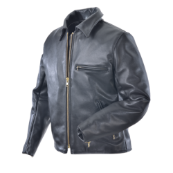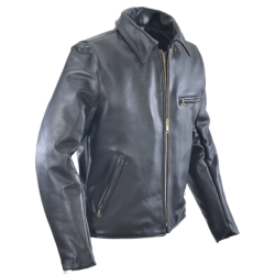 The collar is shirt-style, its hidden snaps keep it from flapping in the wind when riding. Solid brass buckles at the sides allow the waist to be tapered for comfort and to accentuate the broad-shouldered cut. Hand-built with full inside facings and a comfortable rayon lining, it offers you a leather-trimmed wallet-pocket on the inside. A zippered breast pocket on the left is complemented by two zippered slant pockets. Wrist zippers are backed by low-bulk gussets and the sleeves are turned at the ends. If the weather is a little chilly this jacket takes the Vanson Streamliner snap-in vest.