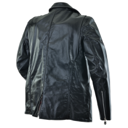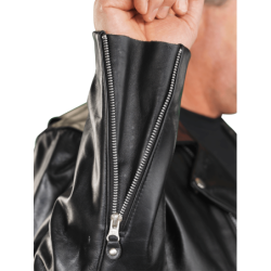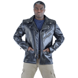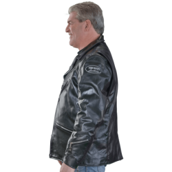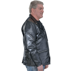 A shaped cutaway under the right side front zipper and the use of a two-way front zipper allow the front to be opened up from the bottom as needed for a comfortable ride. The slant front zipper and wide lapels can either be opened for "The Look", or closed for warmth. On the inside, the jacket is beautifully finished with full facings.