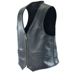 Vanson's classic Zip-Front Leather Vest is stylishly fitted and presented in true chest sizes from 32 to 62. The Vanson vests are beautifully sewn with a man's formal dress construction in the way the backs and fronts are joined at the shoulder. Look closely and you will see that the connection points are perfectly matched and top-stitched open and flat for a comfortable, low bulk, smooth fit over the shoulders. You will also see that this vest is fully finished so the lining is smoothly set into the vest with no raw edges showing. Two front pockets, solid brass front zipper, and a lightweight rayon lining complement this classic design. Available in either competition-weight cowhide or medium-weight Firenze leather. This vest is hand made, great looking, and a throwback to the waistcoats of a more formal time.