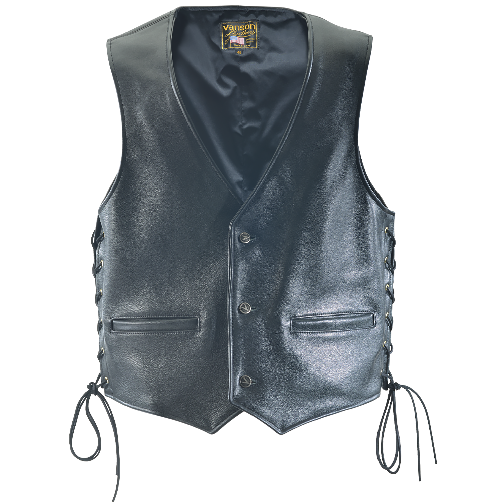 The first vest that Vanson ever made was a button-front Hippie-style vest - which turned out to be a great way to learn how not to build a vest. These early vests had lumps at the shoulders where the front and back were joined together, and the linings and grommets looked as though the primary production tool was an Uzi. But this is how we all learn, by doing, and by realizing that there is a lot more to a "simple" vest than meets the eye. The classic Vanson Tack Button Leather Vest refined styling and hand built to last.