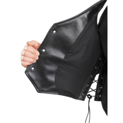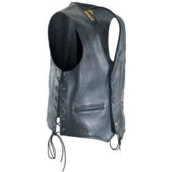 Our good looking, beautifully made Model VLT features two front pockets and lace-up sides for an adjustable fit. The VLT is meticulously constructed with a man's formal dress construction in the way the backs and fronts are joined at the shoulder. Look closely and you will see how all the connection points are perfectly joined and top-stitched, open and flat for a low bulk, smooth fit over the shoulders. You'll also see how the sides are turned and faced evenly so the lining is smoothly set into the vest and the brass side-lacing grommets are neatly set away from the lining in two reinforced layers of leather. Substantial square-cut rawhide laces give a cowboy flair, while enabling a perfectly snug fit. The two single- welted front pockets show the classic heritage of this vest. Available in either competition-weight cowhide or medium-weight Firenze leather. This is a dress vest gone riding and can be worn anywhere.