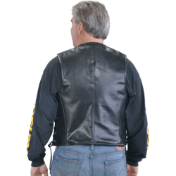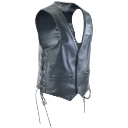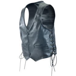 Another enduring Vanson classic our good-looking, beautifully-made Snap-Front Vest features two front pockets and lace-up sides for an adjustable fit. The VLS is meticulously hand-crafted with a man's formal dress construction in the way the backs and fronts are joined at the shoulder. Look closely and you'll see that all the connection points are perfectly joined and top-stitched, open and flat for a low bulk, smooth fit over the shoulders. You'll also see how the sides are turned and faced evenly so the lining is smoothly set into the vest and the brass side-lacing grommets are neatly set away from the lining in two reinforced layers of leather. Rawhide laces give a cowboy flair and enable a perfectly snug fit. The two single-welted front pockets show the classic heritage of this vest. Available in either competition-weight cowhide or medium-weight Firenze leather. This is a dress vest gone riding and can be worn anywhere.