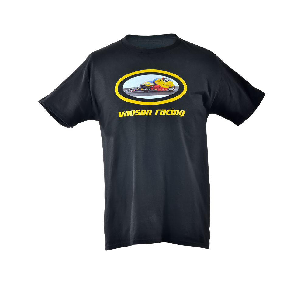 Each shirt is printed one at a time, making it a true limited-edition piece. Designed and built in the USA, this commemorative tee blends racing heritage with classic Vanson craftsmanship and tribute styling.