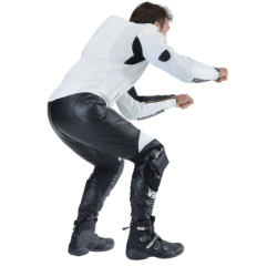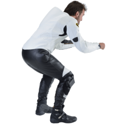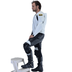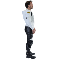 The ventilated athletic nylon mesh lining is fully removable for washing, replacement or repairs to the suit. The backpad is attached by Velcro to twin straps sewn into the shoulder area. Like a hiker's backpack these straps hang it over the spine without pulling down the rear neckline area of the suit. Articulated chest expanders alongside the twin main zippers help maintain a comfortable, concave shape while riding. Elbow expanders set into the upper sleeve let you bend your arm, while keeping the diameter constant, so the sleeve does not creep up, and the protective armor stays where it needs to be. Expander panels set into the back at the rear armhole let you move your arm forward. The off-center knee expander panels give you more flexibility when your leg is swung out. Kevlar® inlays at the crotch and behind the knees help make riding comfortable. At the edge of the knee area are Velcro fields for the included pucks. At the center back lower waist you have an expander panel for tight tuck riding positions.