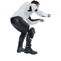 Air flow is important, and the fronts are made of ProPerf perforated leather. The center front bib is laminated to spacer fabric which provides both comfortable cushioning and channels air across the torso; an AeroHump on the back, with a mesh screen across the top, allows air flow at speed into the suit, along the spine.