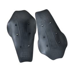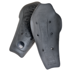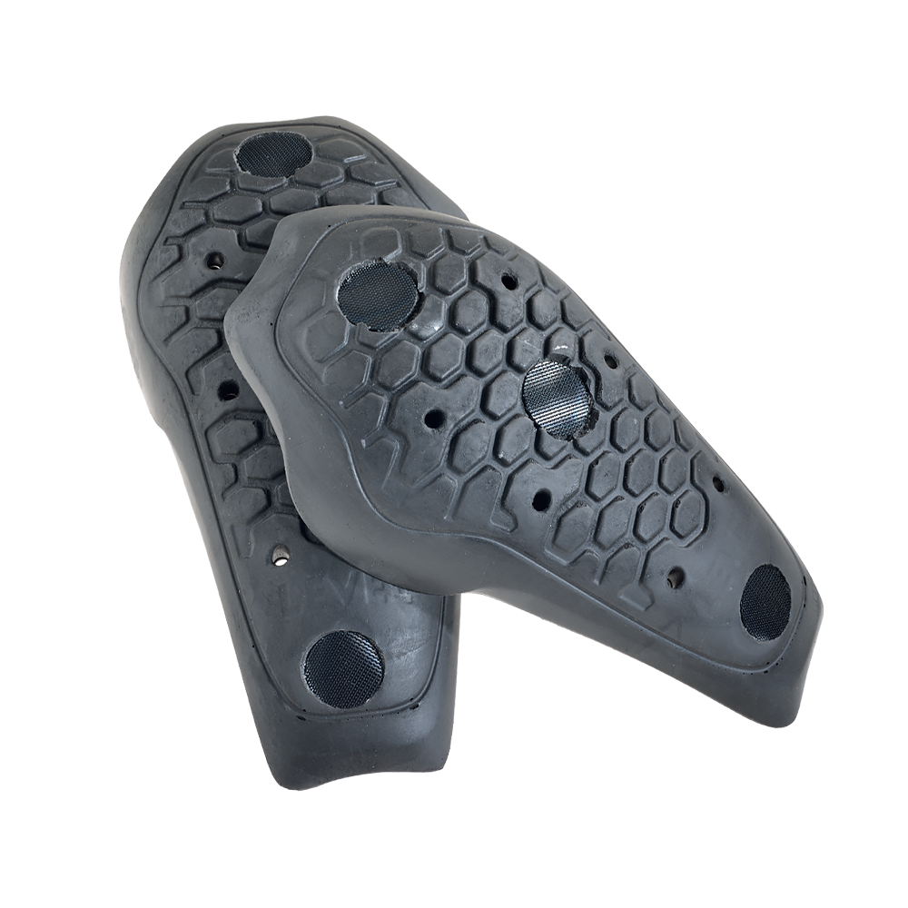 The concept of this system is to both disperse and absorb the force of repeated impacts while providing the best protection. In order to achieve this, it is important that the knee armor remain in the proper position relative to the body and not shift even during a crash. To best achieve this the foam pad becomes an acute shape cradling the armor inside the curve and holding the CE armor snugly against the riders' body.